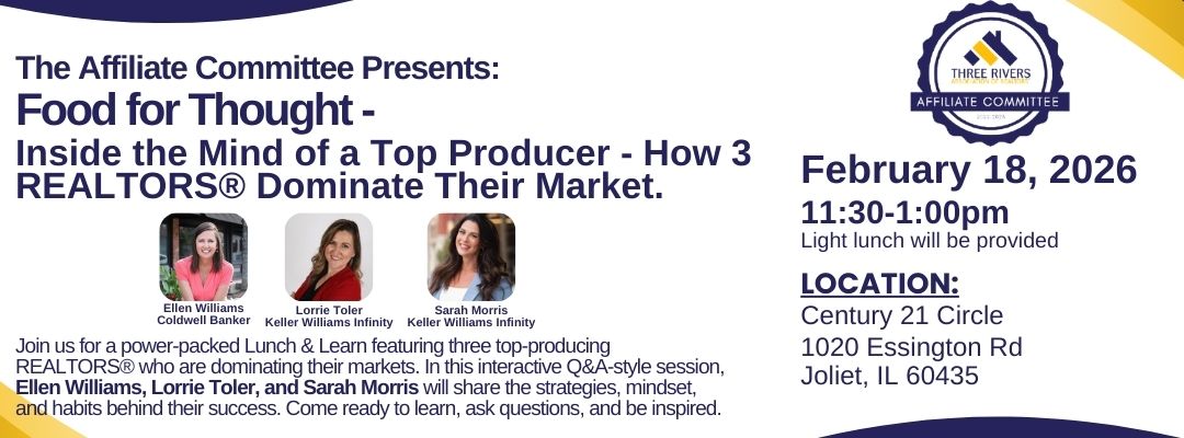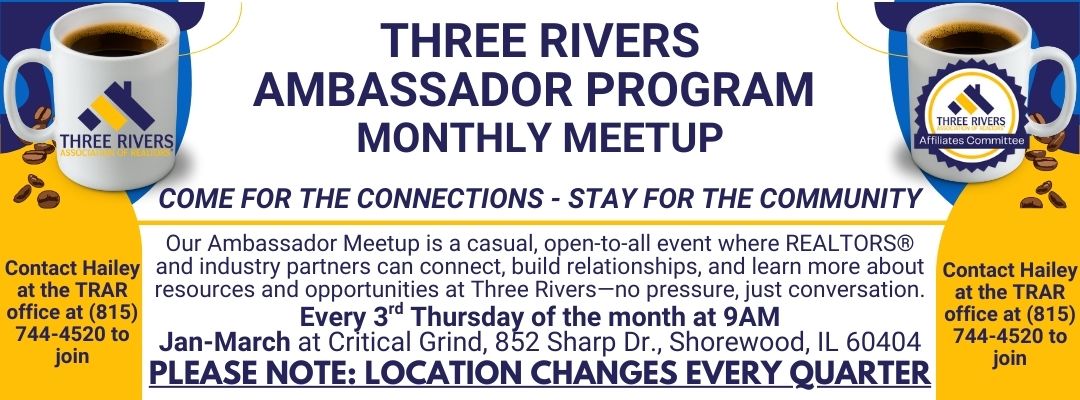 Become A Member FollowFollowFollowFollowFollowFollow Member Account/Login News and Events Register Here Register Here Register Here Listen and subscribe to The Real Estate Ripple today! TRAR Calendar “You guys are more helpful than the IDFPR.” 5 James BegleyDesignated Managing Broker Exclusive REALTORS® 5 Matt PersickettiREALTOR® Oak Leaf Realty “I adore all these new forms – Yay, Three Rivers!” 5 Janet ScanlanREALTOR® Century 21 Pride Realty “I LOVE your new forms section” 5 AnonymousEducator “This is a great association! I am proud to be a contributing member.” 5 Mike MontgomerySr. Mortgage Loan Officer Kind Lending Thank you to you and your whole team for the great communication and follow up! You make a difference for our agents and their businesses! 5 Ron WexlerThe Wexler Group Keller Williams Preferred Realty “Thank you for the new forms! Great job on the new page format, I was able to find a form I needed easily” 5 Mike MusaREALTOR® Keller Williams Preferred Realty 5 Karen Krause RobertsonManaging Broker Crosstown REALTORS® “I would highly recommend involvement with this very professional organization.” 5 Mike Labak MARKET STATISTICS