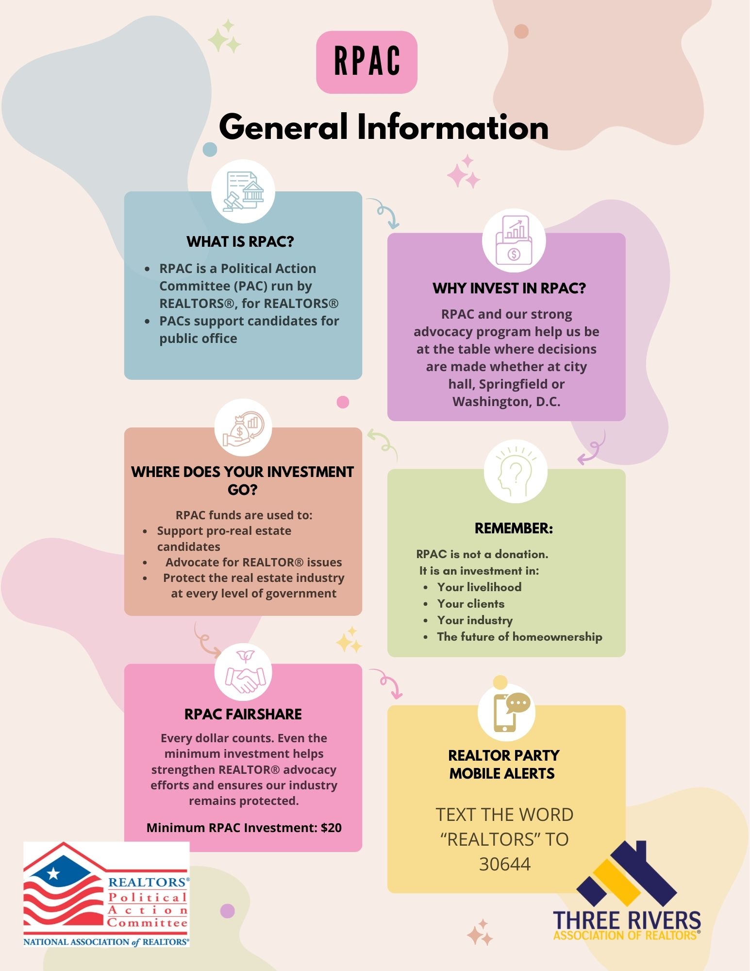 RPAC, established in 1969, is a political action committee (PAC) specifically for REALTORS®. Its primary purpose is to raise and spend money to elect candidates at the local, state, and federal levels who understand and support the real estate profession.