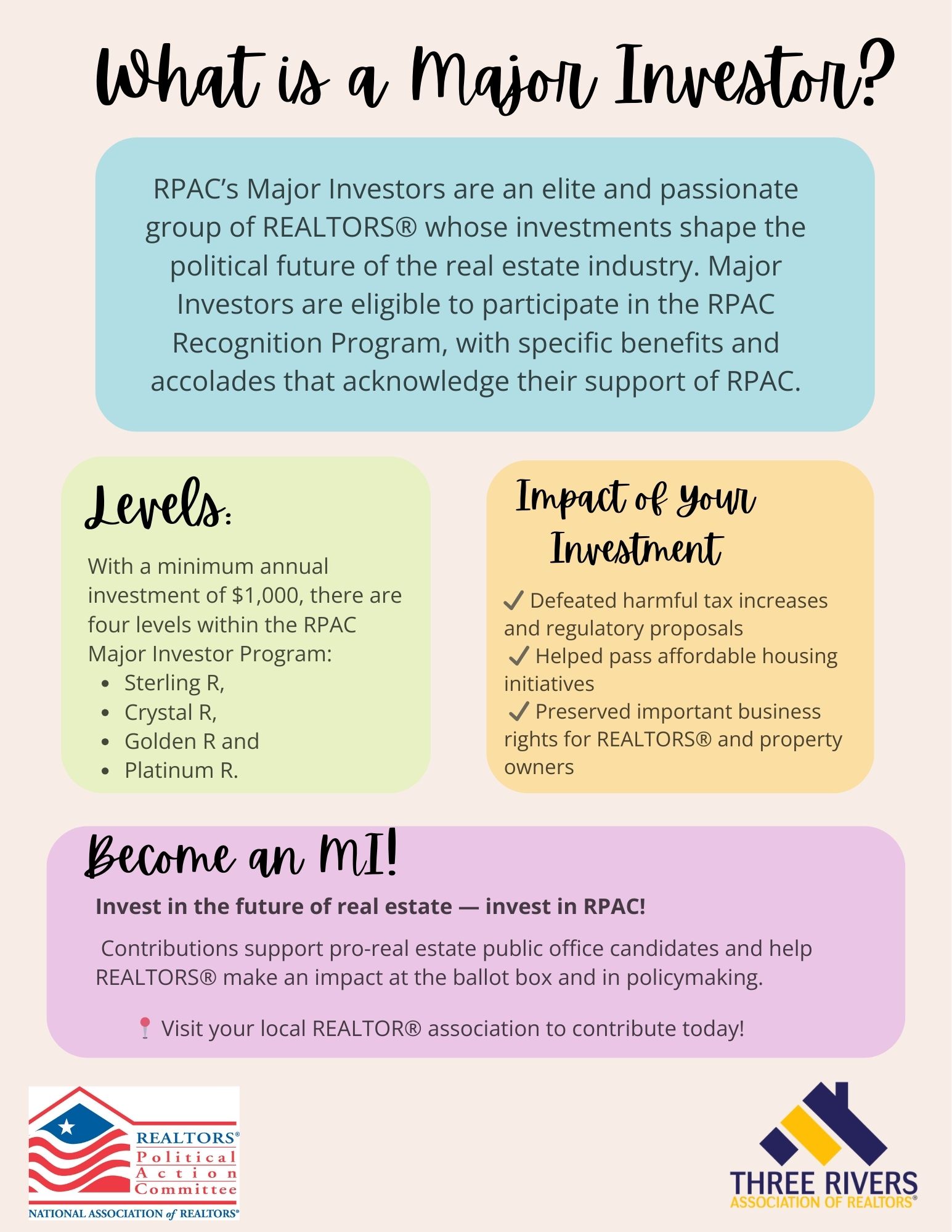 RPAC’s Major Investors are an elite and passionate group of REALTORS® whose investments shape the political future of the real estate industry. Major Investors are eligible to participate in the RPAC Recognition Program, with specific benefits and accolades that acknowledge their support of RPAC.